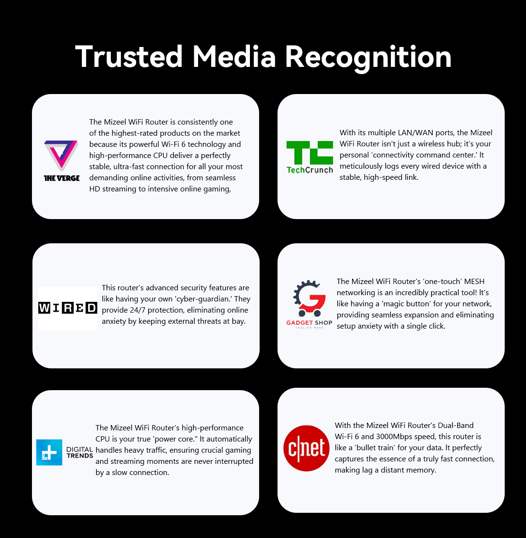Mizeel WiFi Router provides comprehensive, multi-layered security. Equipped with advanced encryption protocols and powerful firewall features, it effectively guards against external attacks and malicious software. This ensures your data and privacy are completely protected, giving you total peace of mind whether you're working from home or simply browsing.